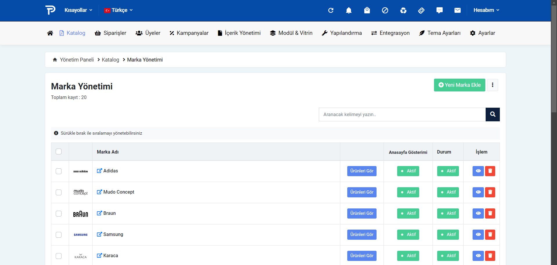 Katalog > Marka Yönetimi sekmesinden yeni markalar ekleyebilir, mevcut markalarınızı düzenleyebilirsiniz.