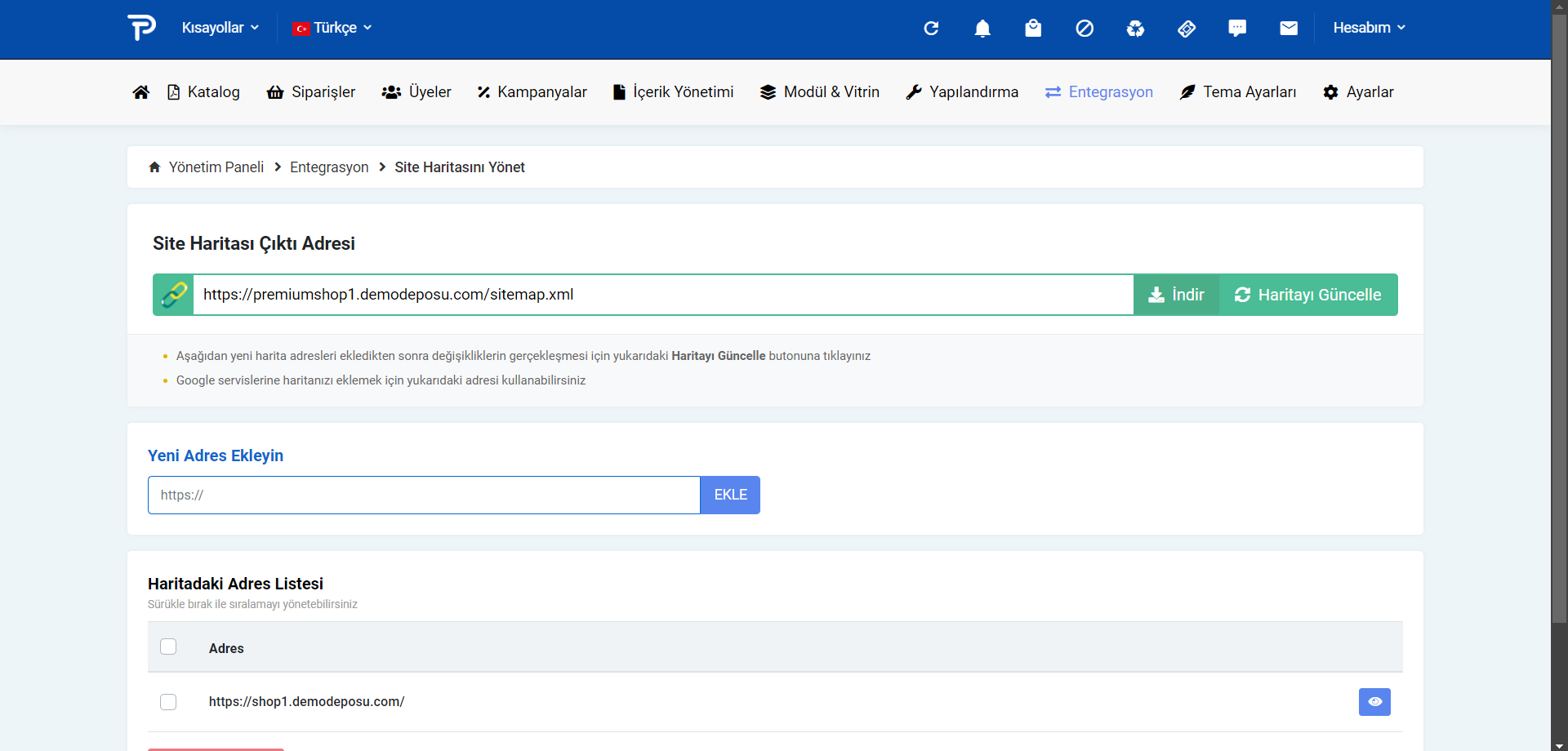 Entegrasyon > Site Haritasını Yönet sekmesinden site haritanızı düzenleyebilir, Google Search Console ile çalışmaya başlayabilirsiniz.
