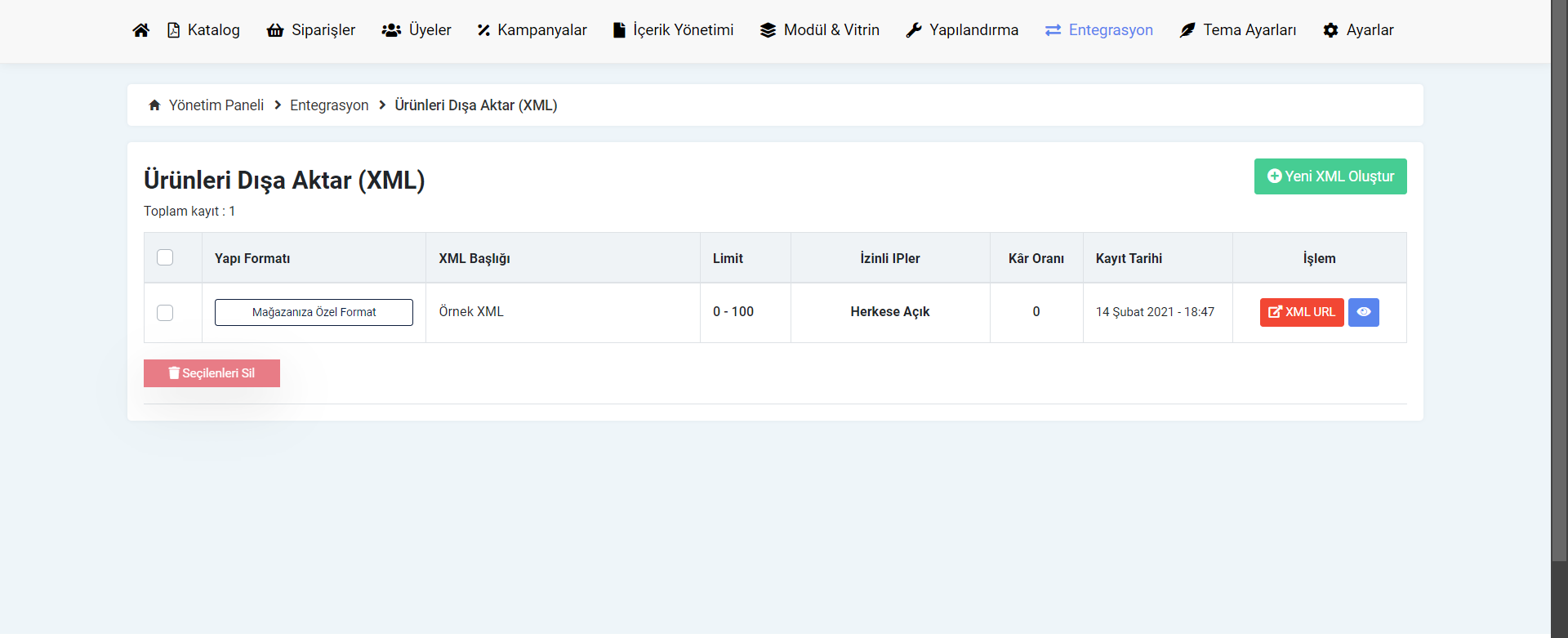 Entegrasyon > Ürünleri Dışa Aktar sekmesinden kategori, kâr oranı, para birimi ve hatta mağazaya verilecek olan IP adresi tanımlaması yaparak XML çıktısı alabilirsiniz
